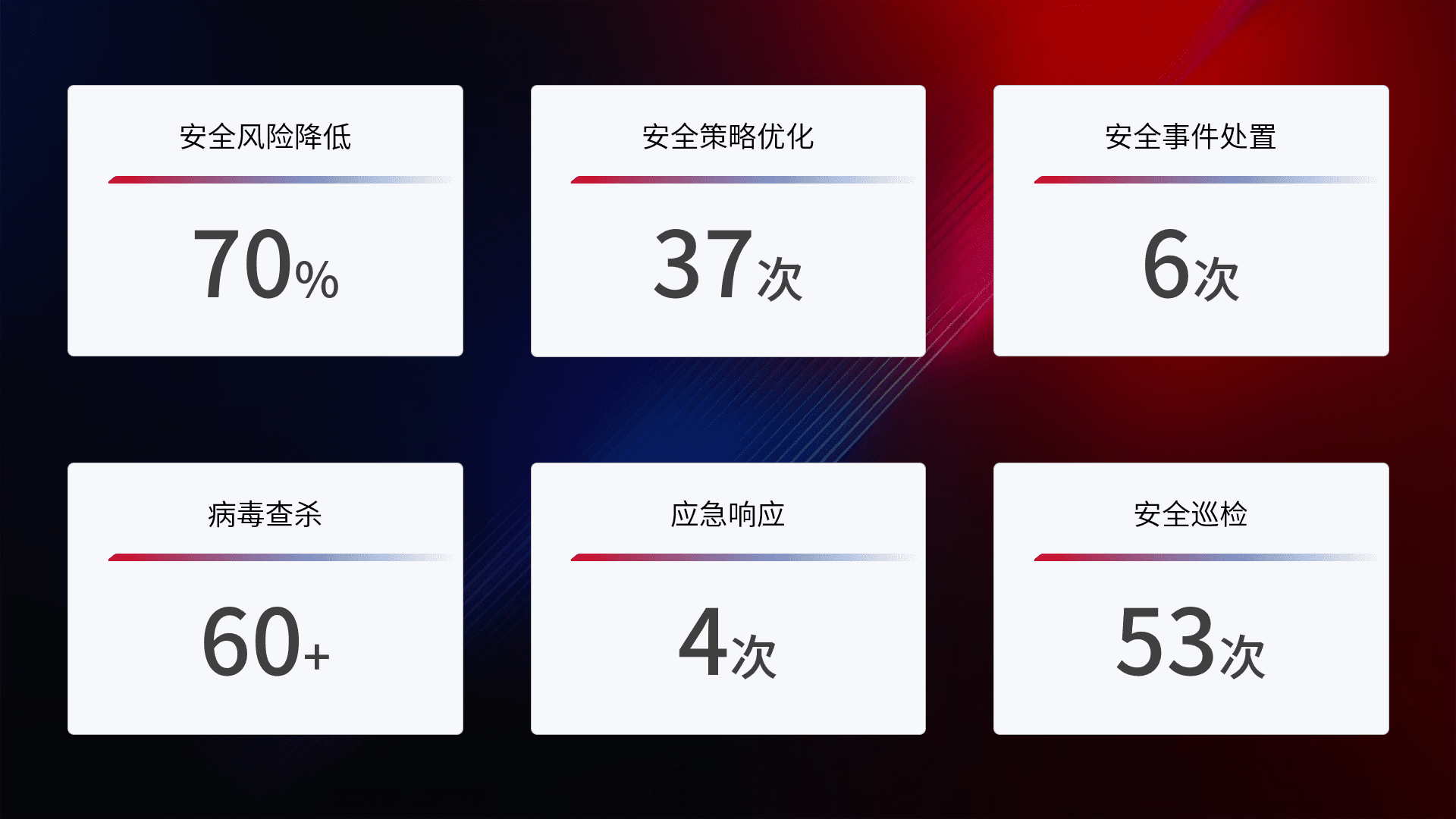 提供全面的安全事件报告体系,,,包括处置报告、、、周报、、、、季度和年度总结,,,,结合持续监控,,,,帮助客户深入了解网络安全状况。。。。