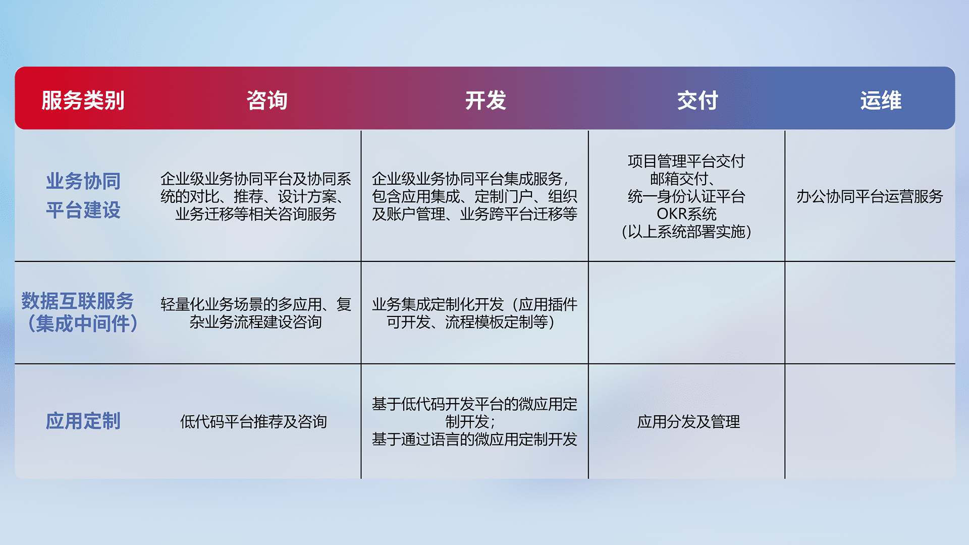 针对钉钉、、、、企微、、IDaas等平台级产品提供产品的规划、、方案、、交付、、定制化开发等服务,,,实现如统一协同办公、、、、智能客户服务、、混合会议管理、、、、智能数据查询、、等业务场景,,实现数字化转型。。。